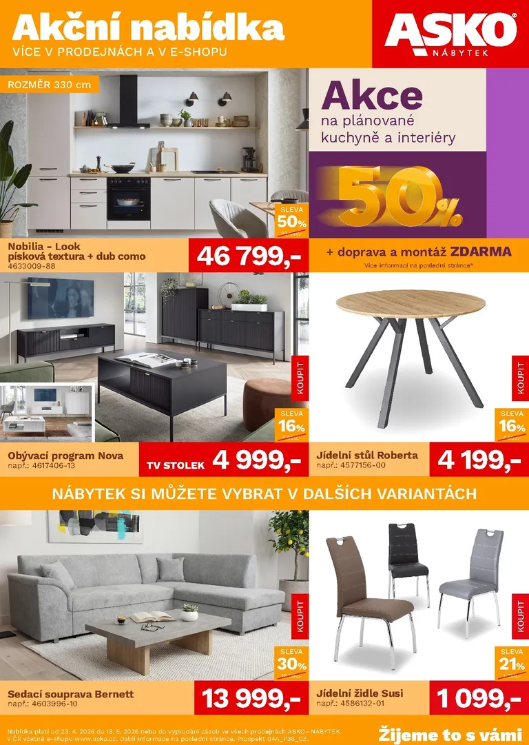 Právě se díváte na aktuální leták z obchodu ASKO nábytek platný od 23.04.2026 do 13.05.2026. V letáku naleznete na 4 stránkách informace o aktuálních slevách. Navštěvujte pravidelně 111Letaky a získejte vždy aktuální informace o všech letácích z nabídek českých obchodů.