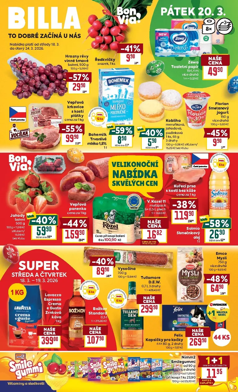 Právě se díváte na aktuální leták z obchodu Billa platný od 18.03.2026 do 24.03.2026. V letáku naleznete na 36 stránkách informace o aktuálních slevách. Navštěvujte pravidelně 111Letaky a získejte vždy aktuální informace o všech letácích z nabídek českých obchodů.