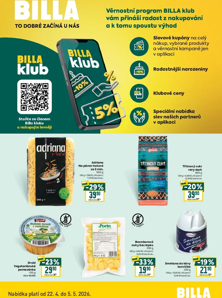 Právě se díváte na aktuální leták z obchodu Billa platný od 22.04.2026 do 05.05.2026. V letáku naleznete na 2 stránkách informace o aktuálních slevách. Navštěvujte pravidelně 111Letaky a získejte vždy aktuální informace o všech letácích z nabídek českých obchodů.