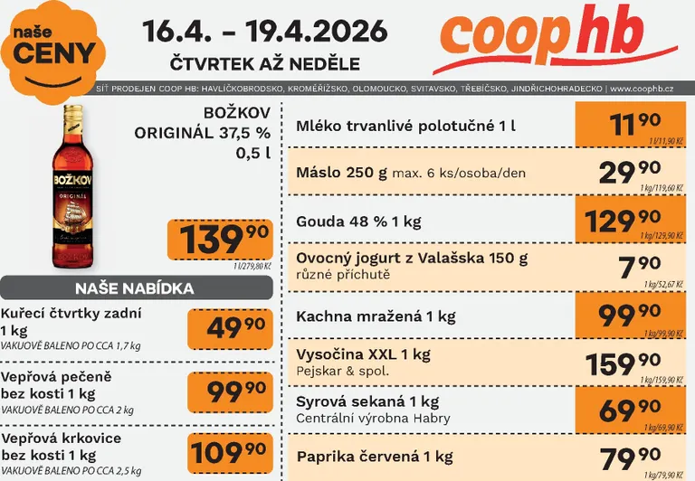 Právě se díváte na aktuální leták z obchodu Coop HB platný od 16.04.2026 do 22.04.2026. V letáku naleznete na 2 stránkách informace o aktuálních slevách. Navštěvujte pravidelně 111Letaky a získejte vždy aktuální informace o všech letácích z nabídek českých obchodů.