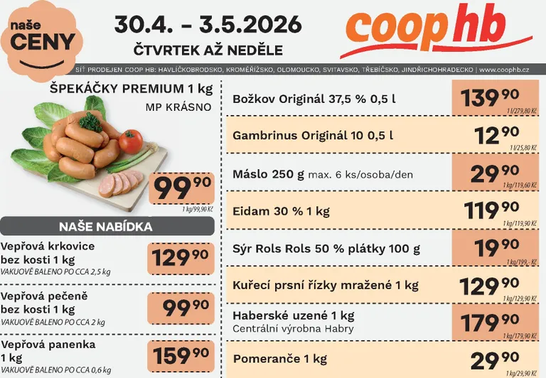 Právě se díváte na aktuální leták z obchodu Coop HB platný od 30.04.2026 do 06.05.2026. V letáku naleznete na 2 stránkách informace o aktuálních slevách. Navštěvujte pravidelně 111Letaky a získejte vždy aktuální informace o všech letácích z nabídek českých obchodů.