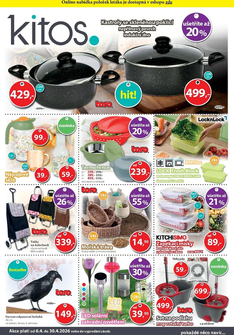 Právě se díváte na aktuální leták z obchodu kitos.cz platný od 06.04.2026 do 30.04.2026. V letáku naleznete na 1 stránkách informace o aktuálních slevách. Navštěvujte pravidelně 111Letaky a získejte vždy aktuální informace o všech letácích z nabídek českých obchodů.