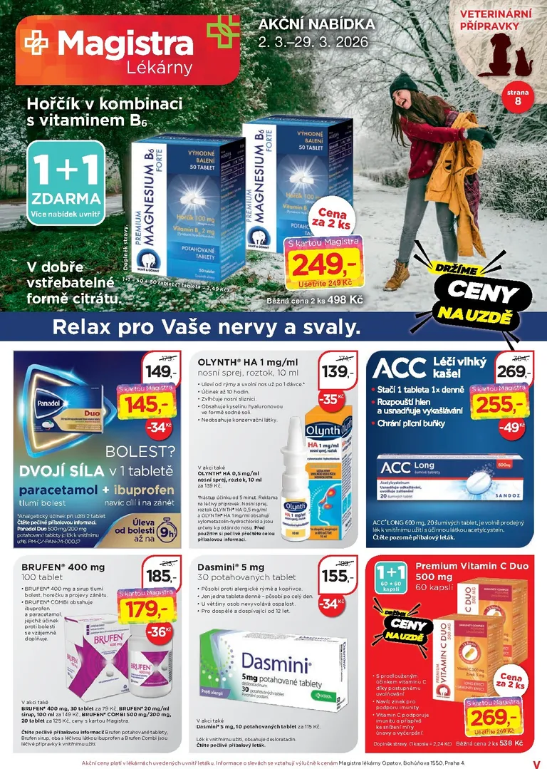 Právě se díváte na aktuální leták z obchodu Magistra Lékárny platný od 02.03.2026 do 29.03.2026. V letáku naleznete na 8 stránkách informace o aktuálních slevách. Navštěvujte pravidelně 111Letaky a získejte vždy aktuální informace o všech letácích z nabídek českých obchodů.