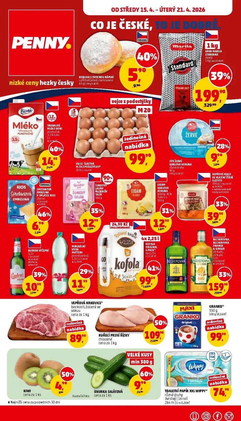 Právě se díváte na aktuální leták z obchodu Penny platný od 15.04.2026 do 21.04.2026. V letáku naleznete na 30 stránkách informace o aktuálních slevách. Navštěvujte pravidelně 111Letaky a získejte vždy aktuální informace o všech letácích z nabídek českých obchodů.