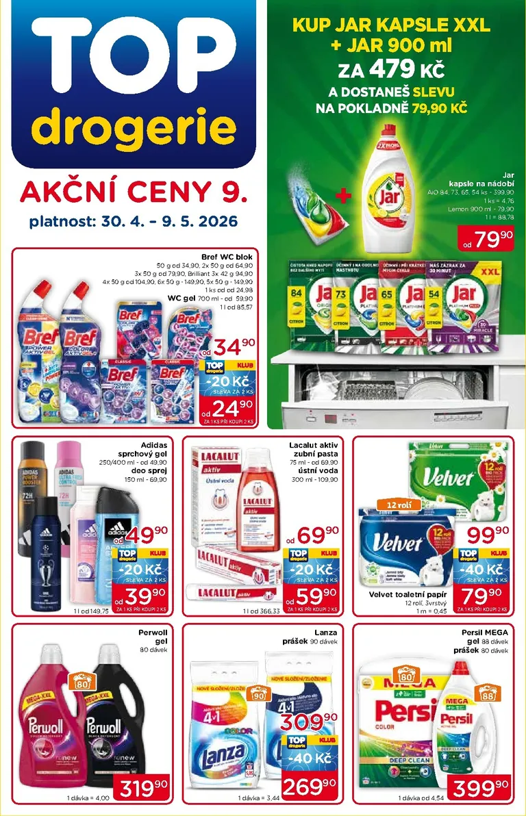Právě se díváte na aktuální leták z obchodu Top drogerie platný od 30.04.2026 do 09.05.2026. V letáku naleznete na 4 stránkách informace o aktuálních slevách. Navštěvujte pravidelně 111Letaky a získejte vždy aktuální informace o všech letácích z nabídek českých obchodů.